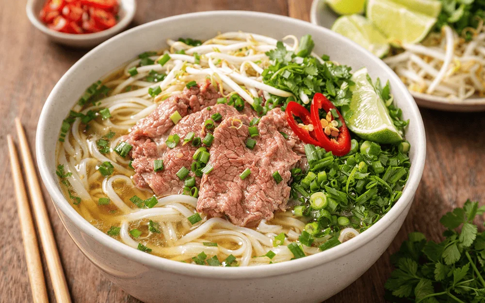 Reisbandnudelsuppe in traditioneller Gewürzbrühe mit Sojasprossen, Rotzwiebeln, Lauchzwiebeln und vietnamesischen Kräutern