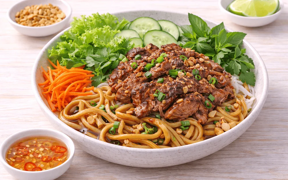 Gebratenes Rindfleisch auf Reisnudeln mit gemischtem Salat, Kräutern, Erdnüssen, Röstzwiebeln und hausgemachter Fisch-Limetten-Soße, leicht scharf