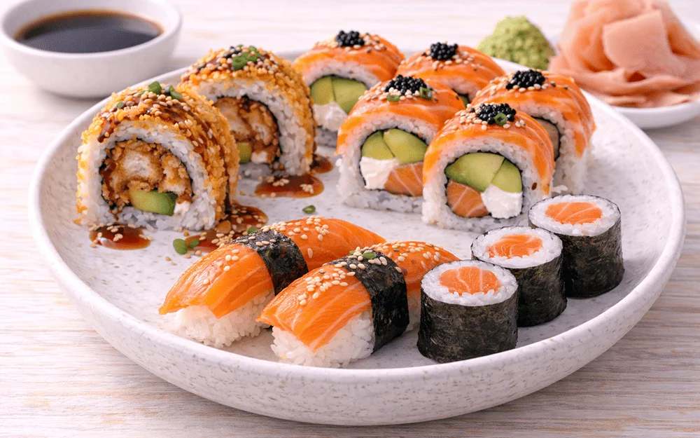 8 Alaska Roll, 8 Tuna Inside Out, 8 Chicken Crunchy, 8 Lachs Maki, 8 Mango Maki, 8 Avocado Maki, 3 Lachs Nigiri, 3 Tuna Nigiri